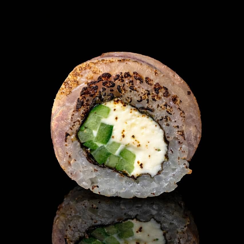 Состав: рис, нори, сыр Филадельфия, огурец, тунец, кисло-сладкий соус.