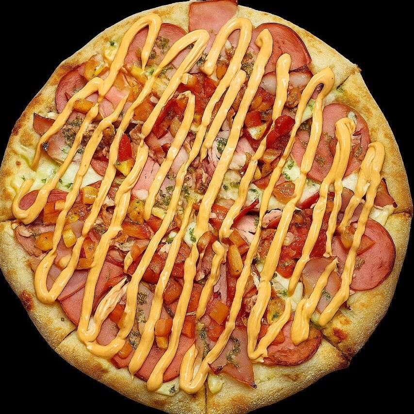 Основа: чесночная. Состав: сыр моцарелла, пепперони, бекон, ветчина, красный лук, перец сладкий, помидор, соус гриль, базилик.