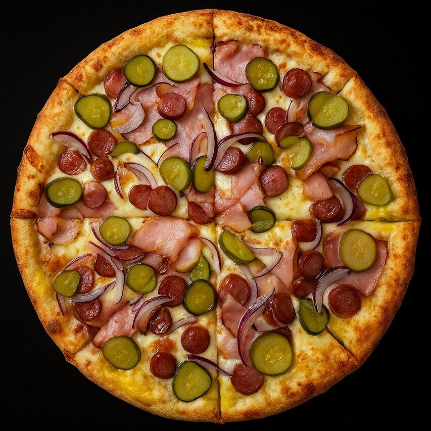 | Состав пиццы | Базилик, Бекон, Красный лук, Огурчик, Охотничьи колбаски, Сыр моцарелла |