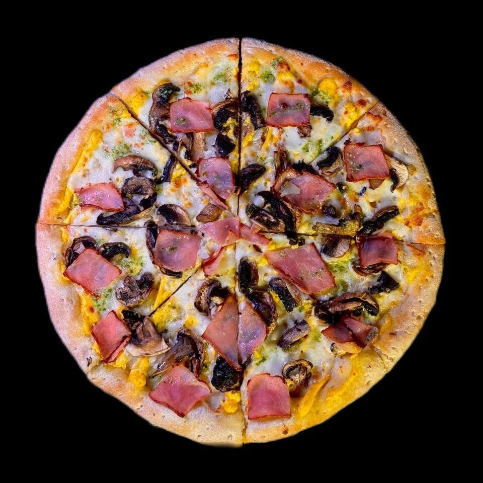 | Состав пиццы | Базилик, Бекон, Грибы, Красный лук, Сыр моцарелла |