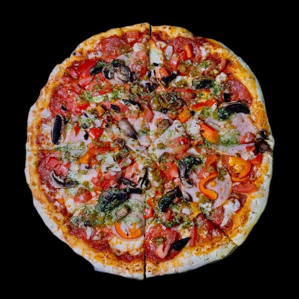 | Состав пиццы | Базилик, Ветчина, Грибы, Красный лук, Пепперони, Перец сладкий, Перец халапеньо, Помидор, Сыр моцарелла |