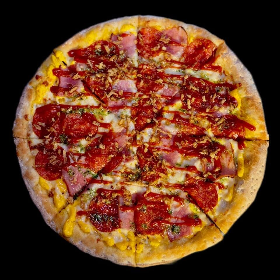 Жарко и хрустко! Сырная основа, пепперони, бекон и криспи лук под сладким чили и сыром моцарелла — остро, сочно, насыщенно.