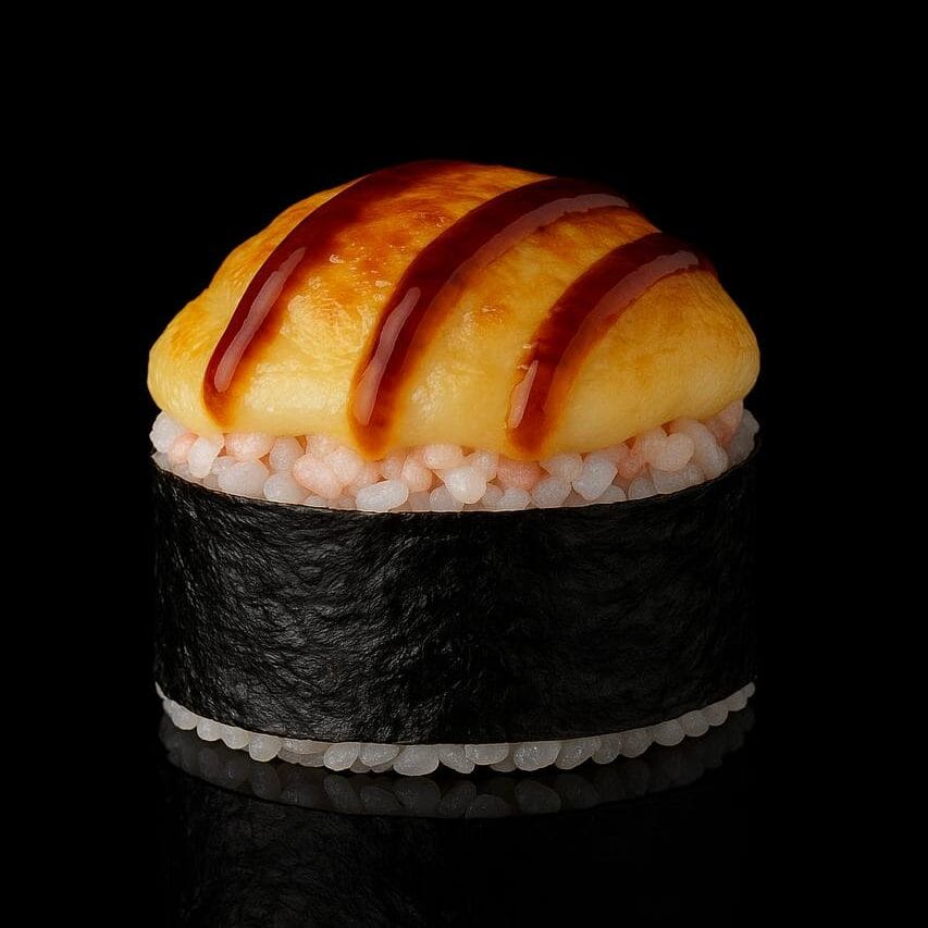 Состав: рис, нори, сыр Филадельфия, лосось, угорь, огурец, икра летучей рыбы, сырная шапочка.